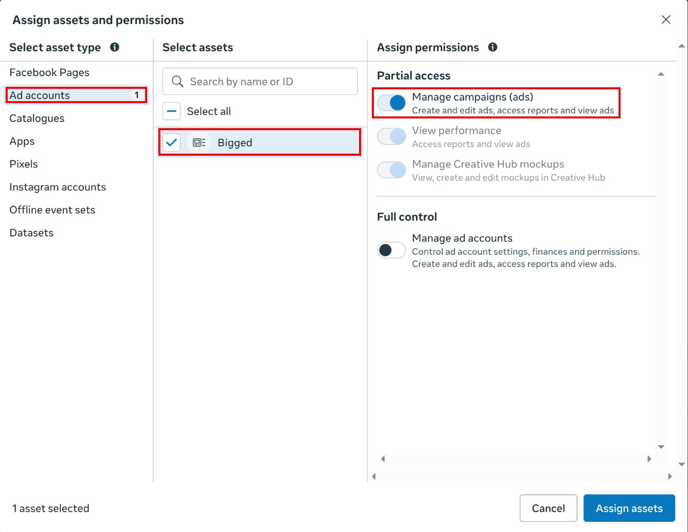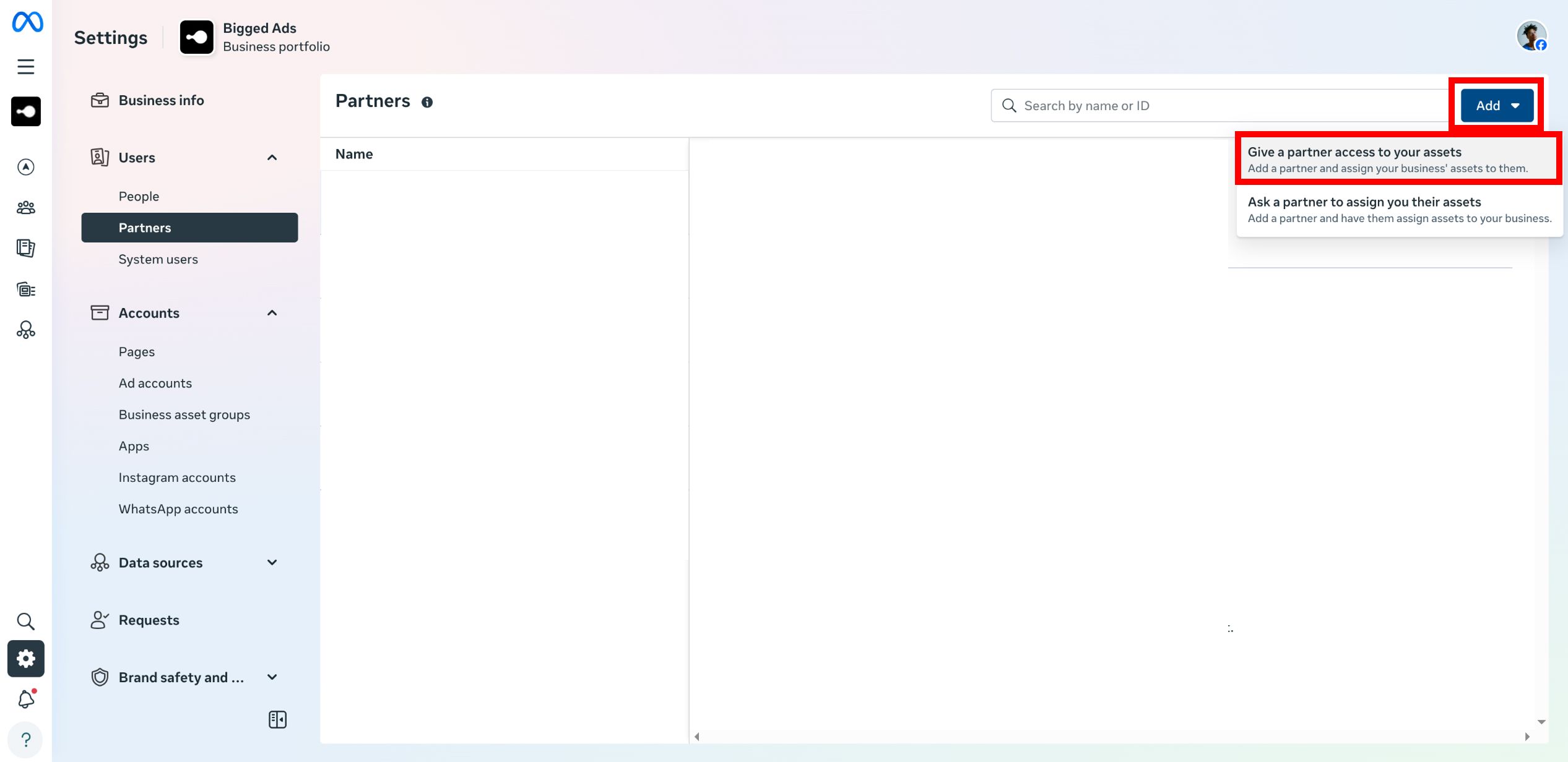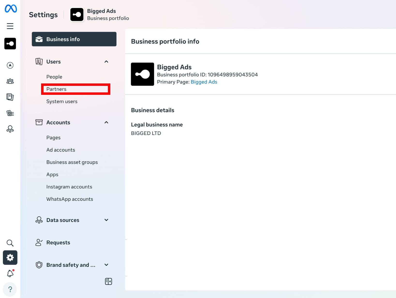 If you are following this tutorial to assign Bigged as a partner, our Meta partner ID is: 1096498959043504.