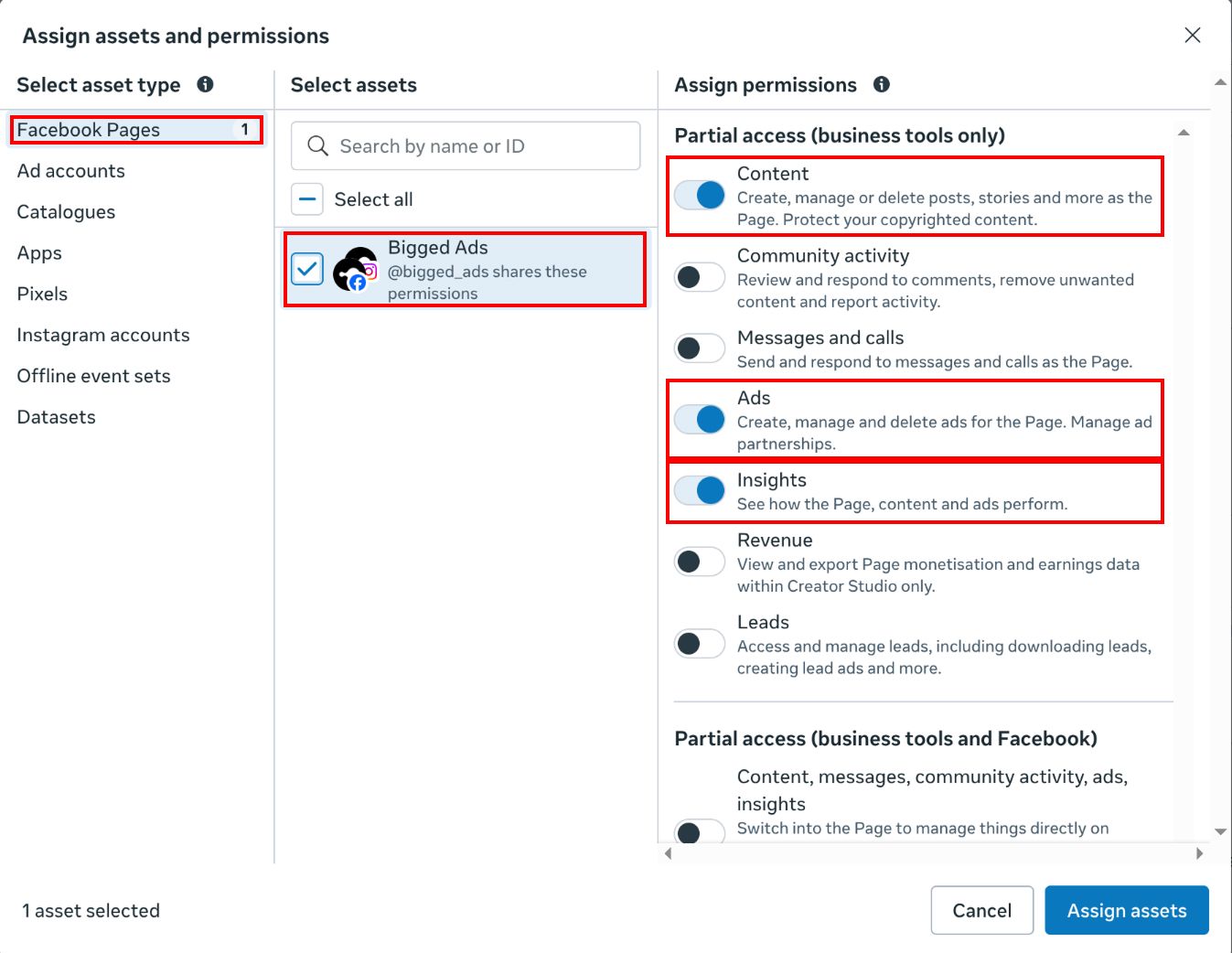 5. Click "Facebook Pages", then select all the Facebook pages that are used whenever you create ads, and then turn on "Content", "Ads" and "Insights". In the example screenshot below, the "Bigged Ads" Facebook page and "@bigged_ads" Instagram accounts are linked, so this setting will give access to both. If however, the 2 accounts are not linked, you will have to separately give access to the Instagram account by clicking "Instagram accounts" on the left hand side, selecting the correct account then turning on "Content", "Ads" and "Insights".
